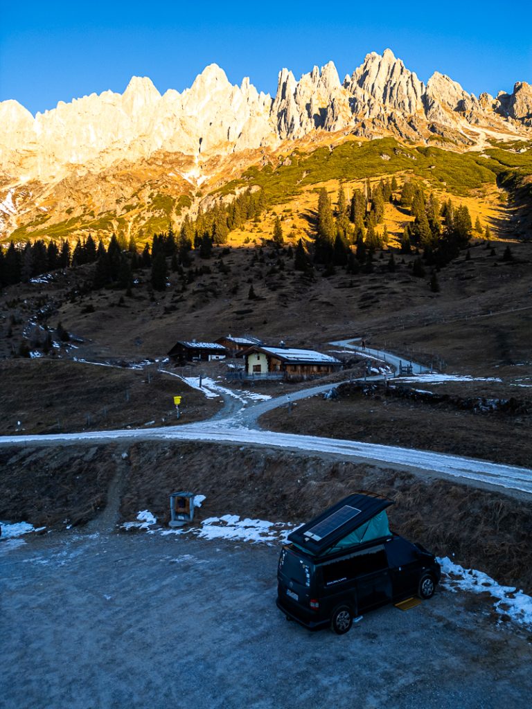 To nie jest zwykły parking. To noc pod jednym z najpiękniejszych masywów w Austrii.